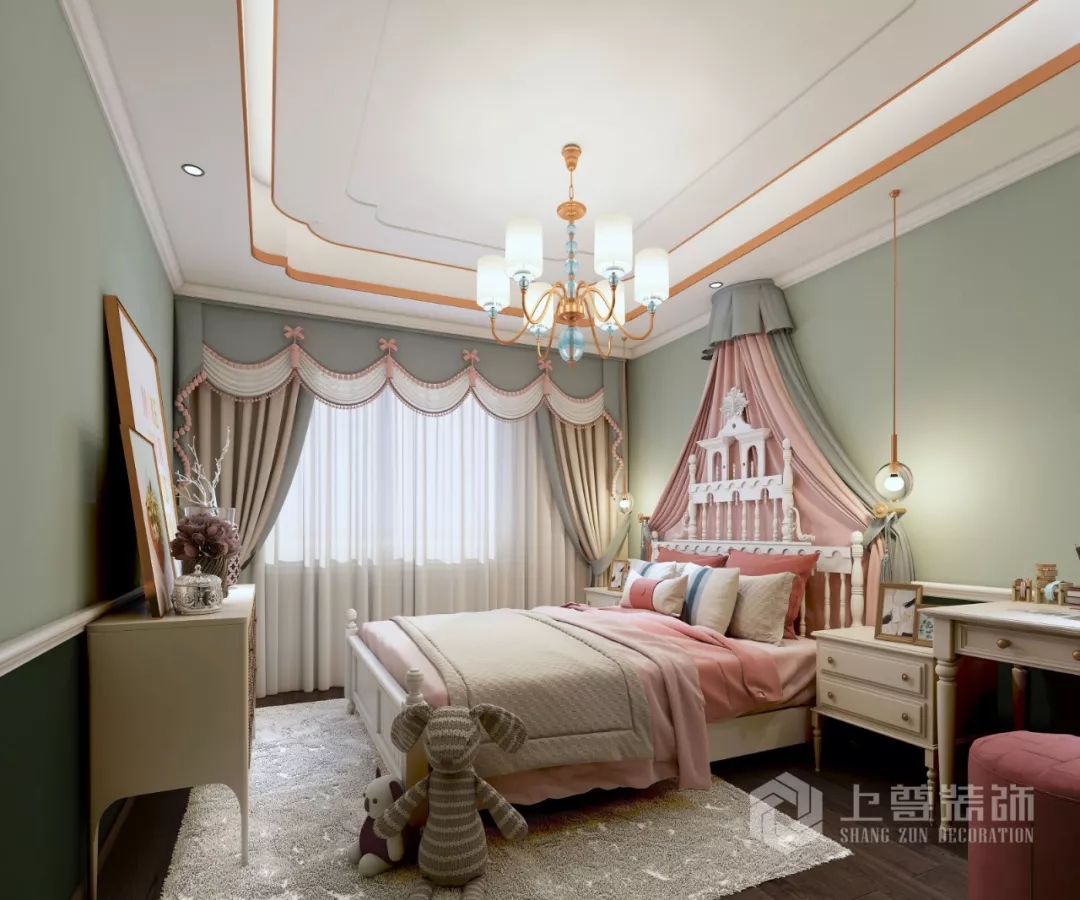 女儿房作为套房,是小公举休息和学习的空间,屋顶在颜色搭配上延续全屋整体色调,增加了设计的整体感;床和背景采用了粉红与绿色结合,使空间不失活泼,童趣的特质,增加了整个空间的视觉冲击。